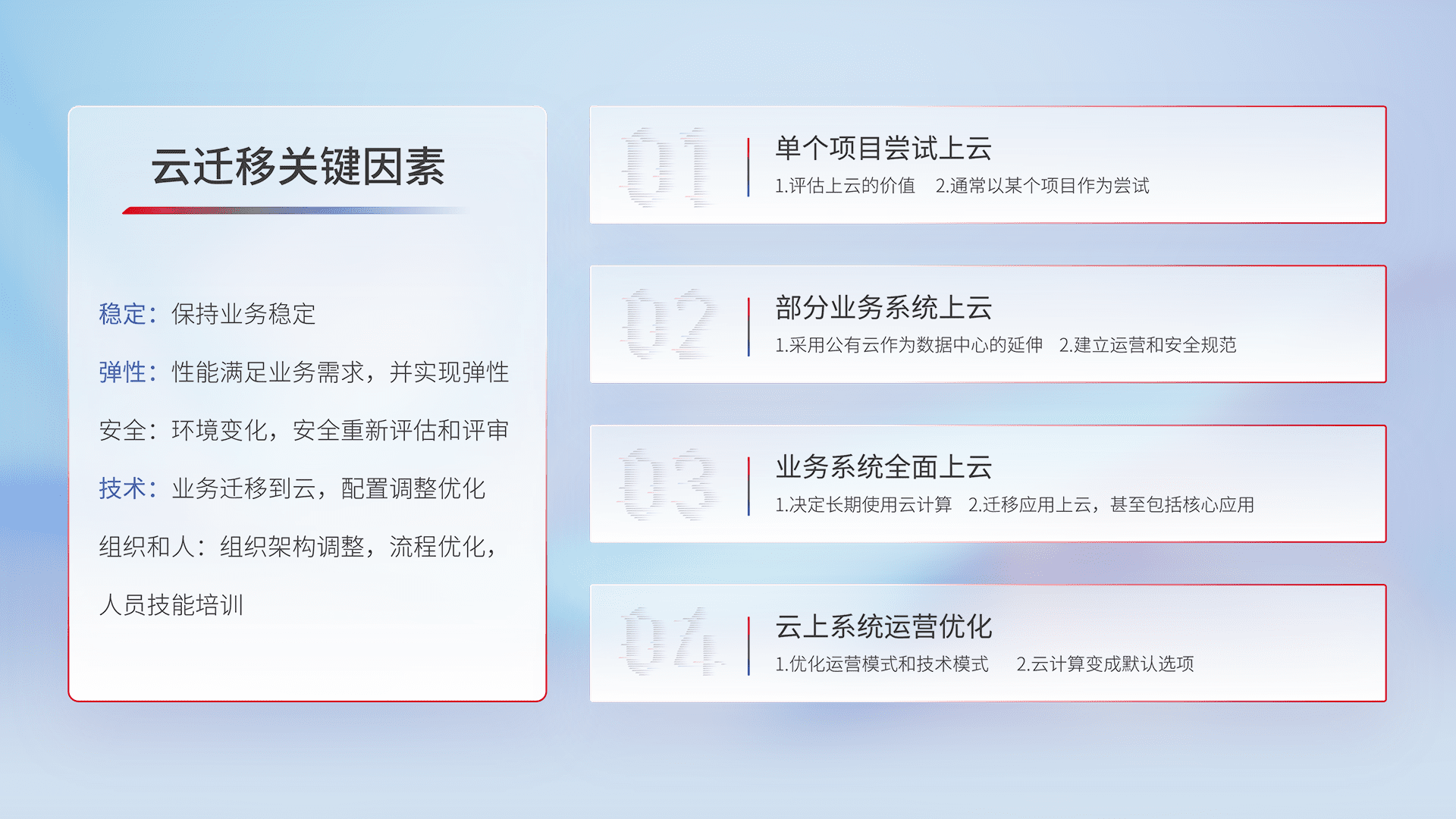 结合实际业务,,从规划设计、、、云平台选型、、、云原生改造、、数据迁移、、、集成交付,,,迁移全过程为客户识别最佳上云路径,,,做好风险识别管理,,,设计网络架构、、、、身份权限、、安全审计合规、、操作审计、、、、日志审计、、监控告警策略、、、多站点容灾设计等,,,对云上基础设施进行整体规划,,,,提升IT治理水平,,,,以满足弹性、、、高可用、、、高性能的需求。。。