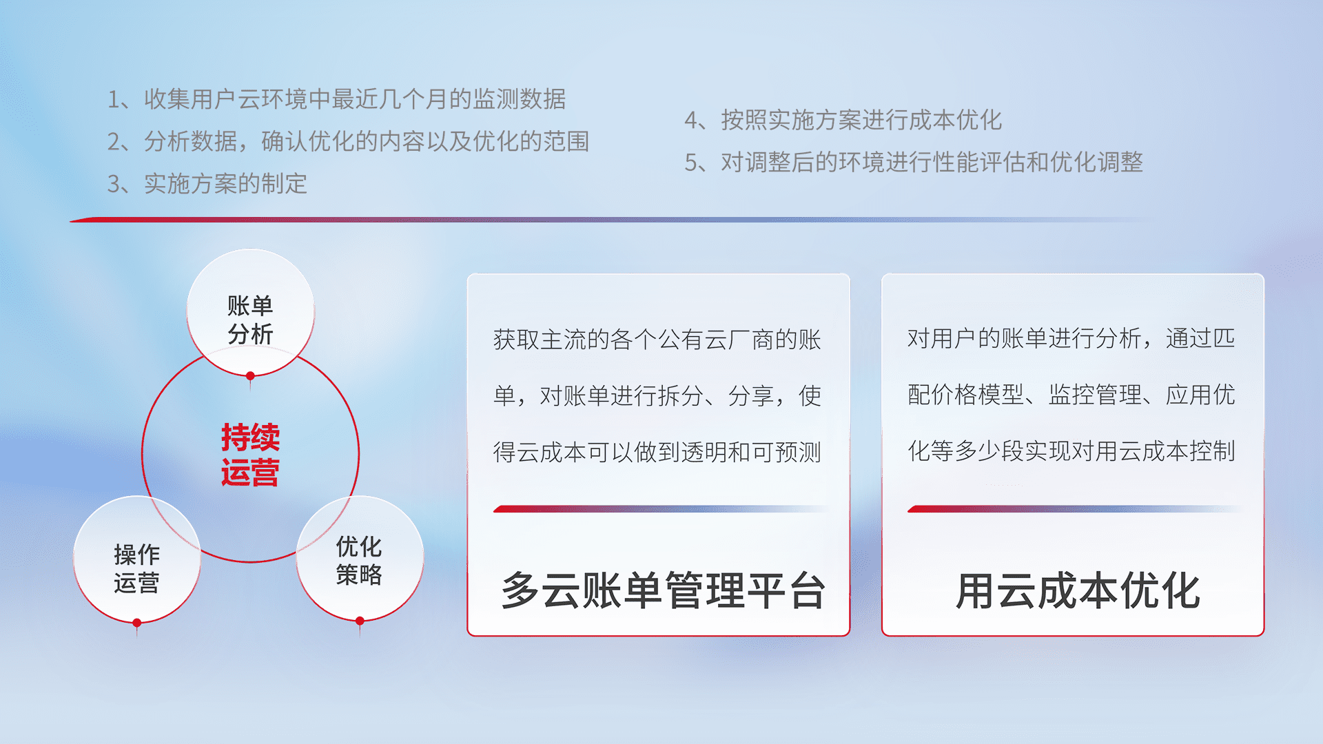 通过多云纳管,,以统一的资源数据模型把客户的云资源进行抽象和封装,,,进而实现对多云资源的统一操作,,,,保障云资源管理的可靠性、、稳定性与可用性。。。。量身定制化运维内容,,,配置、、、、开发运维、、、补丁管理、、备份、、监控、、、认证和访问管理、、审计和日常巡检等,,,,保障在用云过程中的可靠度,,稳定度以及高可用率。。